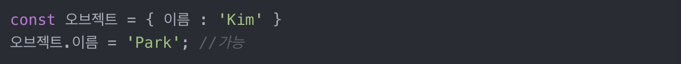 const 변수에 오브젝트를 담으면 오브젝트 내의 데이터는 변경 가능하다