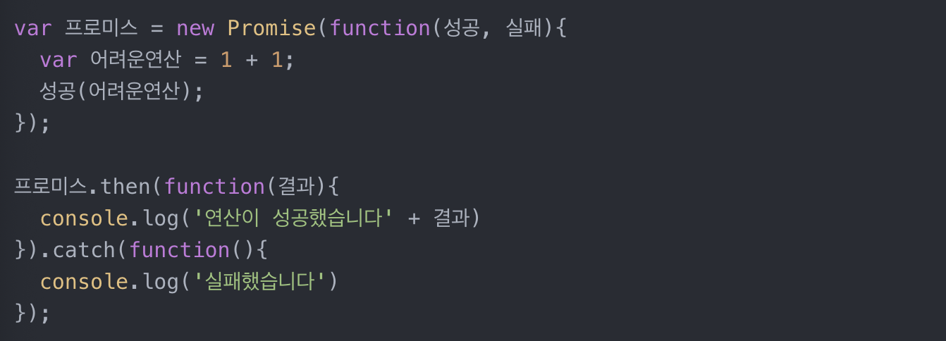 2. 콜백함수는 불가능한 '실패시 특정 코드를 실행해주세요~'라고 코드를 짤 수 있다.(catch)