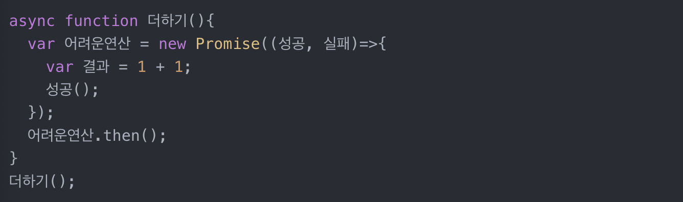 이제 Promise 만들 때 했던거 처럼 then을 붙여서 더하기() 함수가 성공한 뒤에 뭔가를 실행시킬 수 있다.