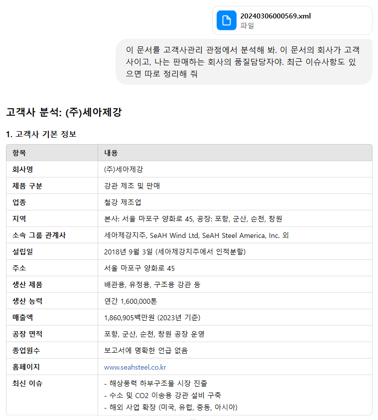 추출한 사업보고서와 반기보고서의 XML 파일을 ChatGPT에 입력해, 품질 담당자 관점에서 중요한 항목(고객사, 홈페이지, 매출액, 제품 등)을 분석하도록 했습니다.