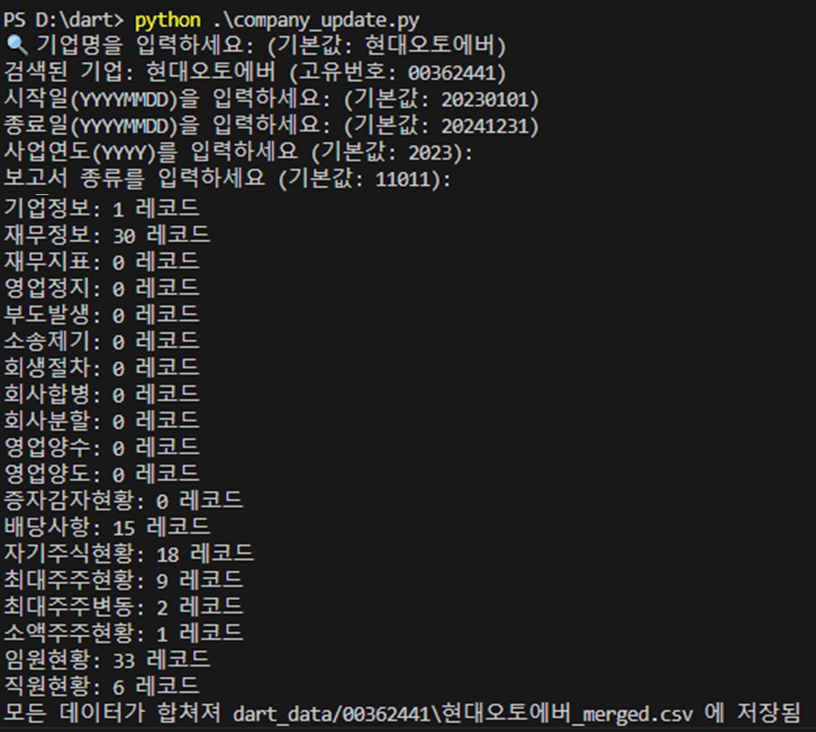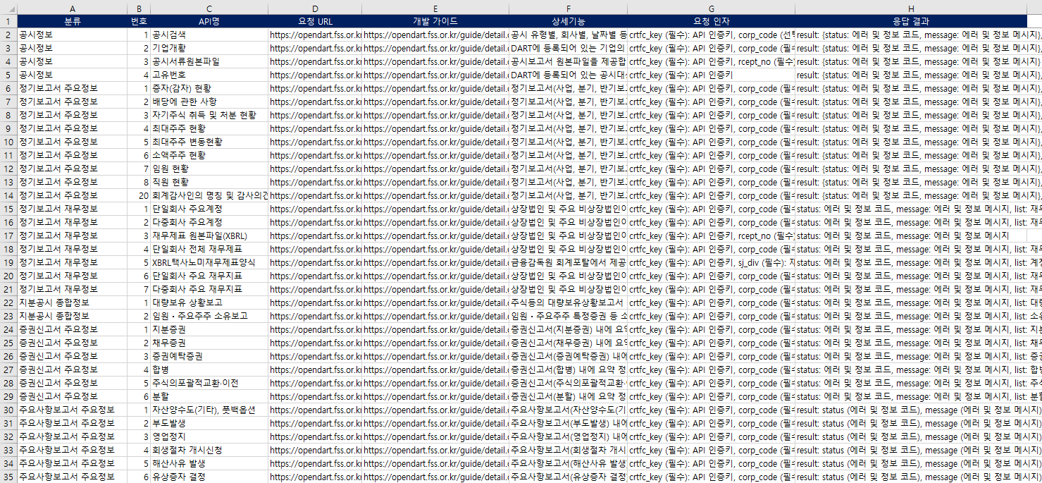 Manual_DartAPI.xlsx 파일에 정리해 두었으며, 이 문서를 바탕으로 각 API 엔드포인트의 사용법과 특징을 꼼꼼하게 파악할 수 있었습니다.