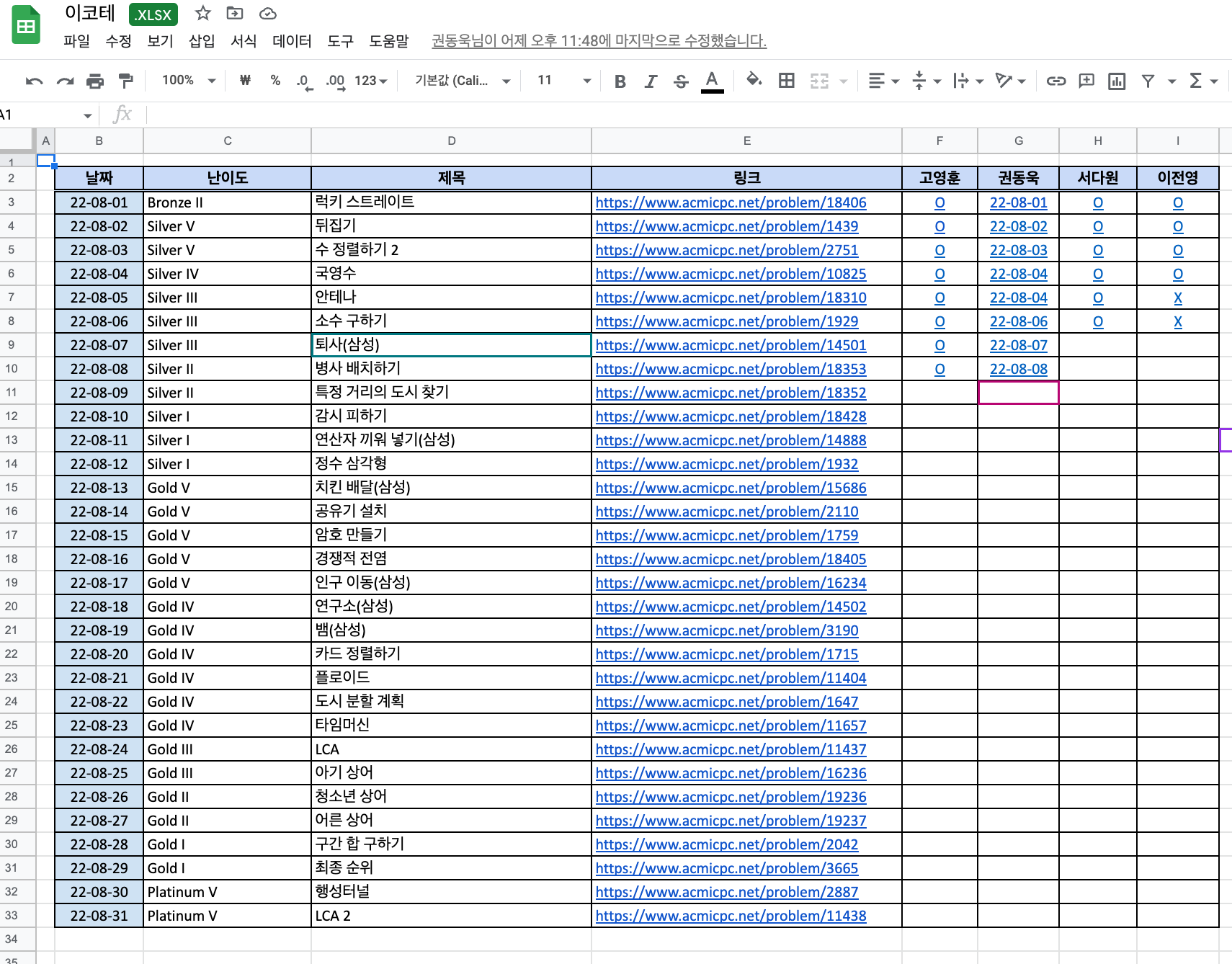 팀프로젝트 진행했던 팀원들과 함께 매일 문제 푸는 방식으로 시작했다. 저 엑셀 표는 동욱님이 만들어 주셨다. 감사합니다.
