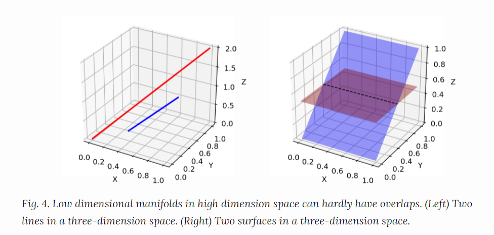 - 저차원 manifold는 고차원 공간에서 거의 겹치지 않습니다. 왼쪽은 3차원 공간에서의 직선, 오른쪽은 3차원 공간에서 평면.