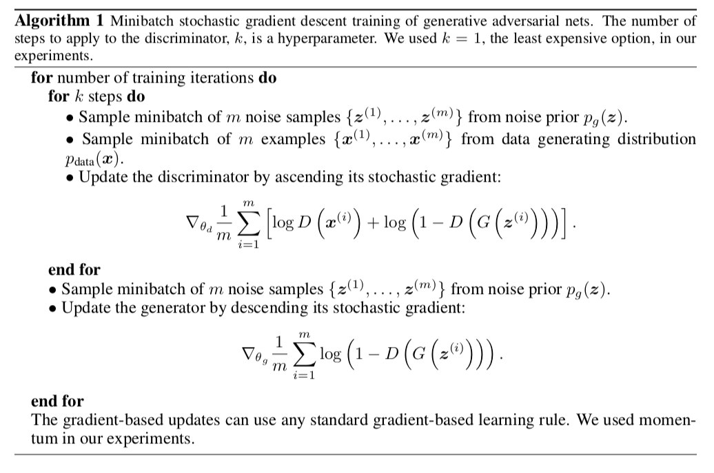 - 특이한 사항은 학습 한번을 진행할 때 discriminator는 k번 학습하지만 generator는 1번만 학습하는 것 입니다.