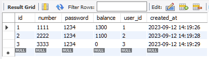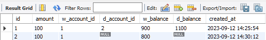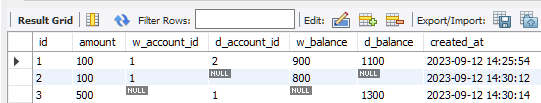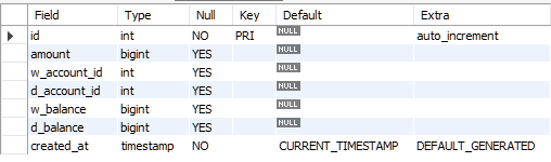 insert into history_tb(amount, w_balance, d_balance, w_account_id, d_account_id, created_at)