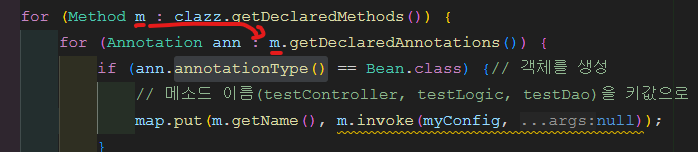 정리하면, m에서 클래스의 메소드 정보를 읽어오고 이중for문을 통해서 어노테이션을 읽어온다