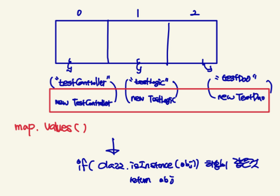 모든 어노테이션을 돌면서 메소드 이름(testController, testLogic, testDao)을 키값으로 하여 값을 생성한다.
