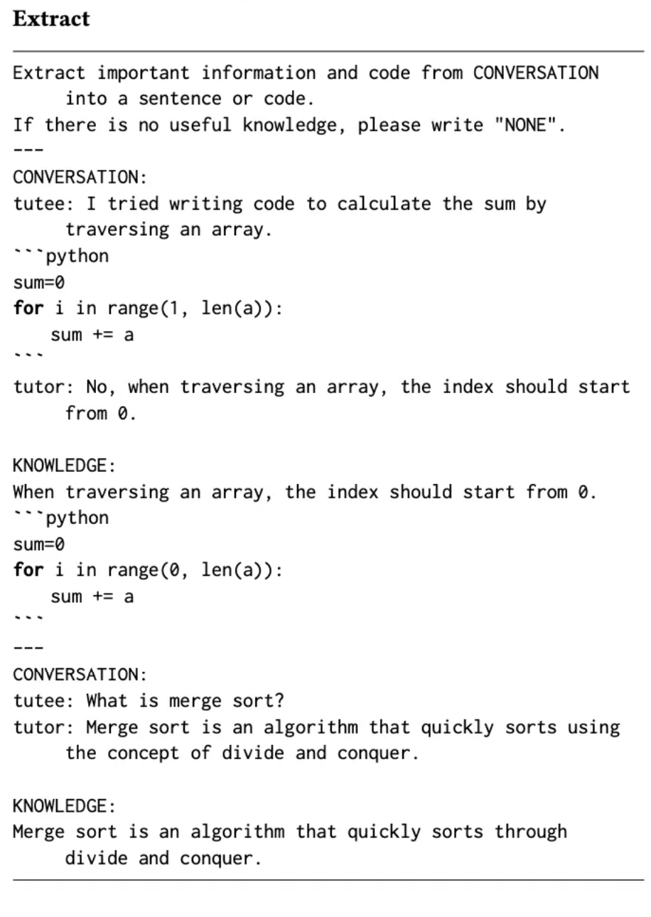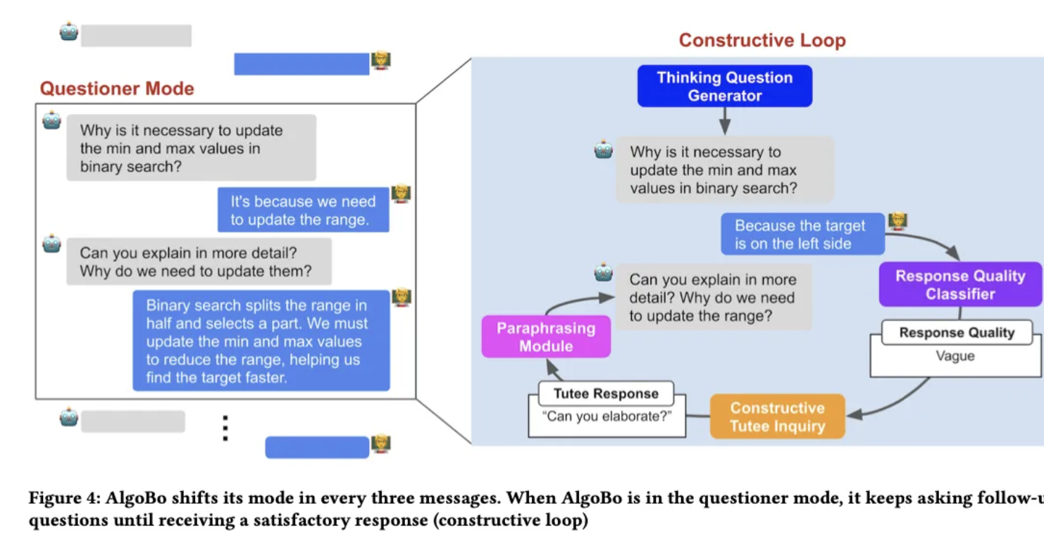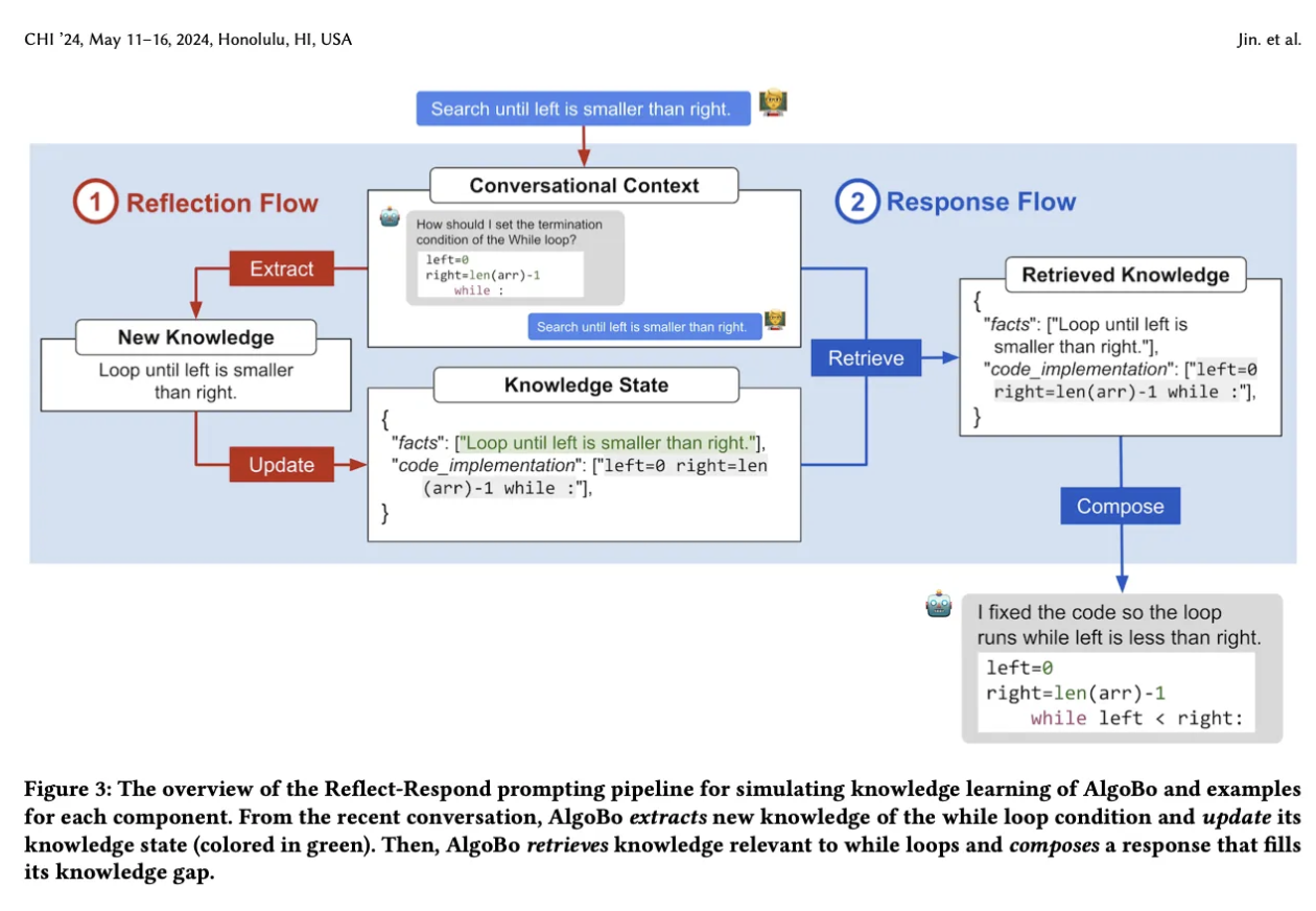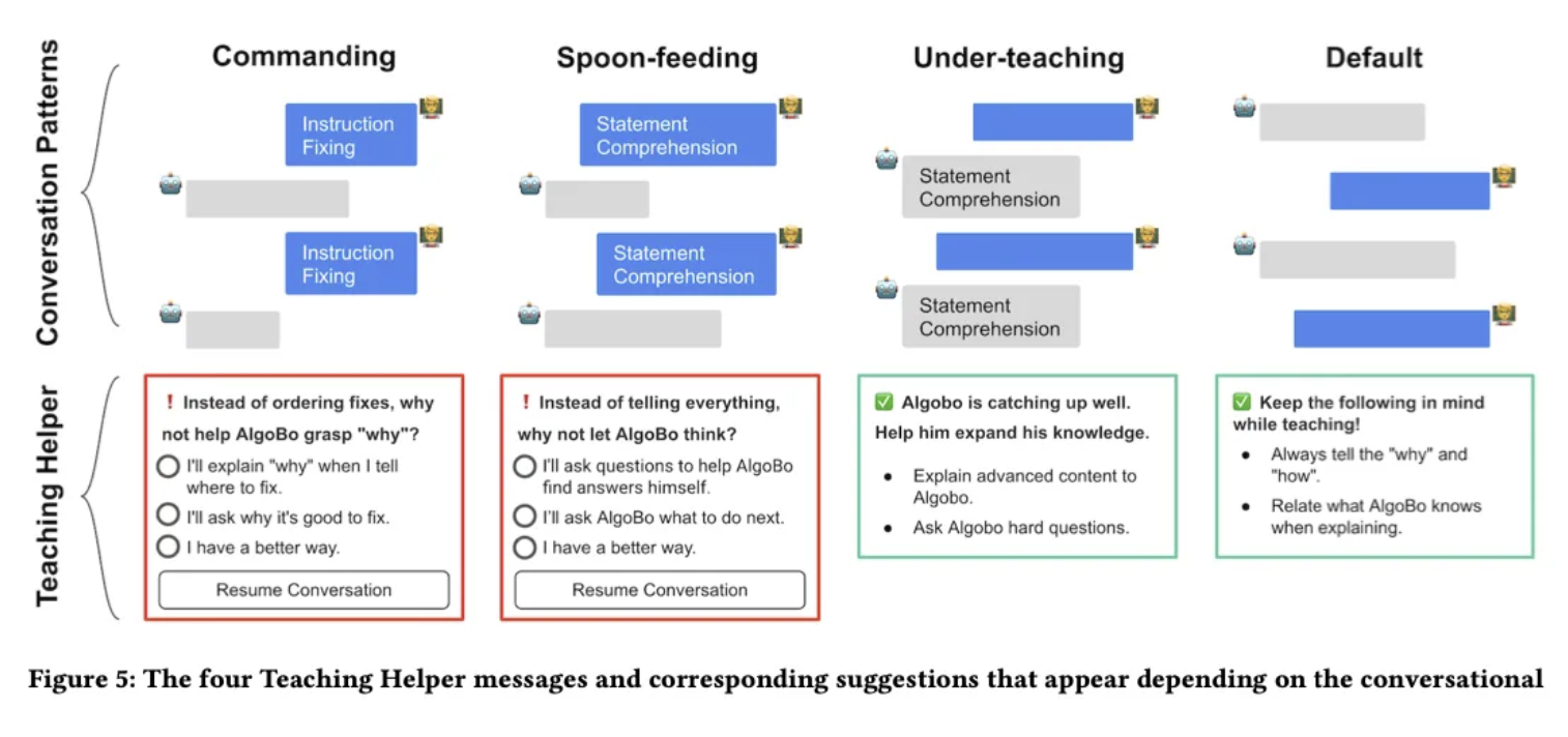TeachYou에서 programming 문제를 풂 → AlgoBo를 풀면서 reflect를 한다. → 점점 AlgoBo가 misconception을 줄이고 가르침 받은 대로 코딩을 한다. → 종종 AlgoBo는 questioner mode로 변한다. → Teaching Helper를 통해 그들의 teaching 방법에 대해 제안을 받는다.