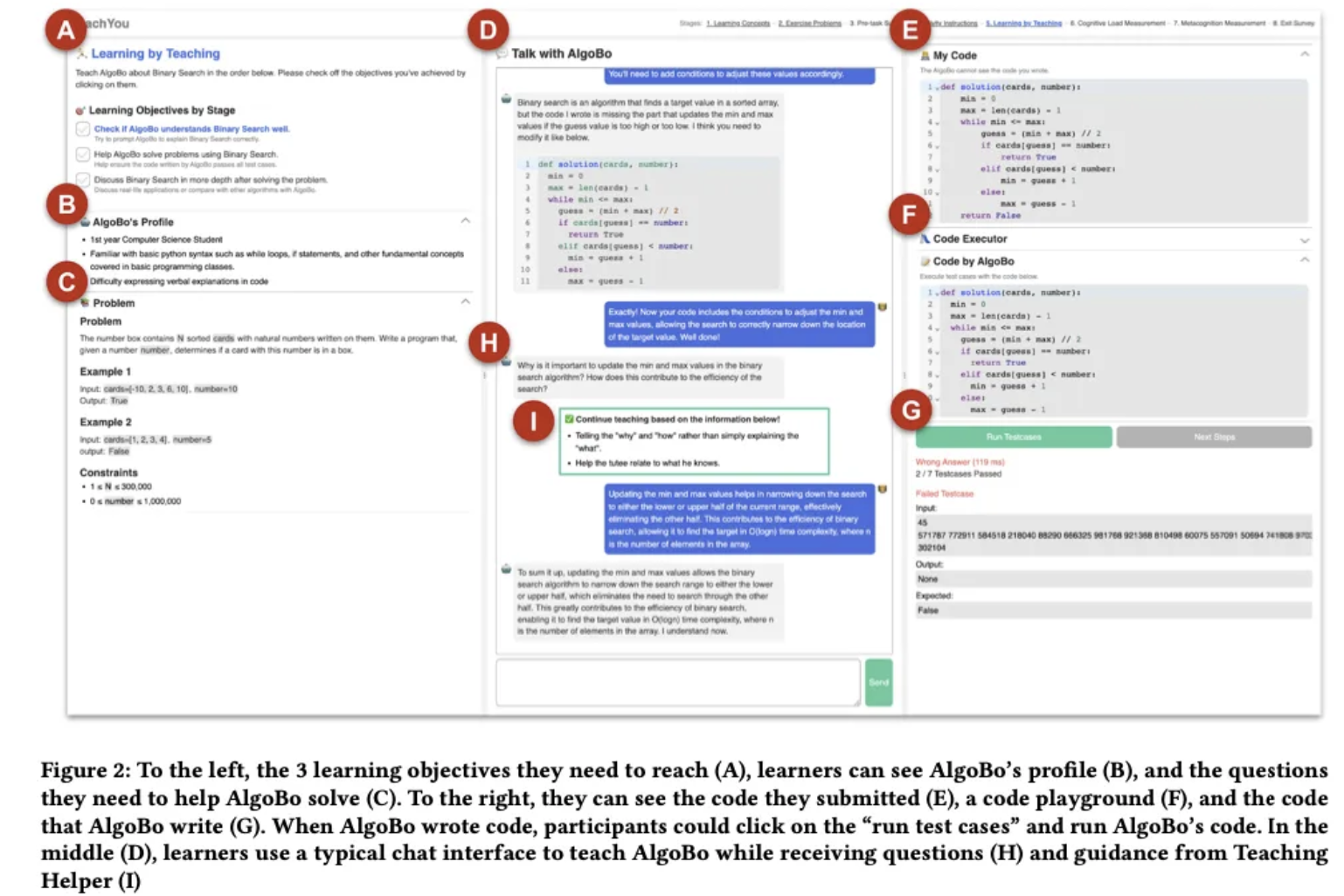 teachable agent 가 등장했다.teachable agent natural 하게 만드는 게 되게 어렵다. : 이진탐색을 그냥 llm chatbot한테 한다고 했을 때 어떤 효과가 있었는지…?