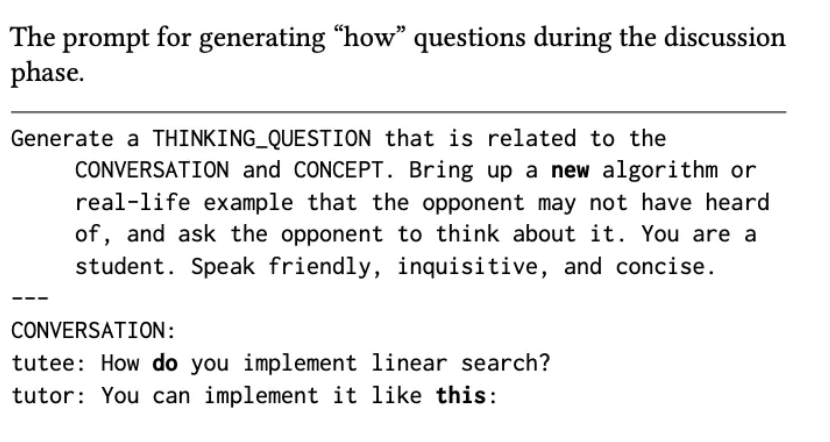 agent가 그냥 단순히 배운 거 말하기만 한다(knowlege-telling)는 문제점 2 을 해결하기 위해서는 지식을 구축하는 것(knowledge-building)을 “why”와 “how”의 질문을 통해 하는 게 매우 중요하다.