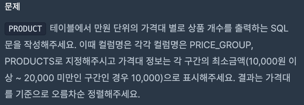 예를 들어, PRICE가 15000인 경우 TRUNCATE(PRICE, -4)는 10000을 반환하고, 25000인 경우에는 20000을 반환한다. 이렇게 해서 가격대별로 상품을 그룹화하고, COUNT(*)를 사용하여 각 가격대별 상품의 수를 세어 PRODUCTS 열에 저장한다.