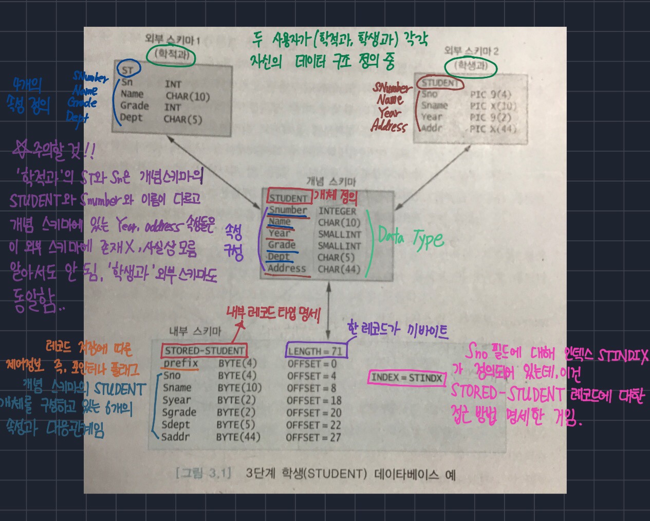 하나의 데이터베이스를 세 단계로 나누어 기술하는 것을 3단계 데이터베이스 구조라 하고 각 단계에서의 스키마를 외부 스키마,개념 스키마, 내부 스키마라 한다.