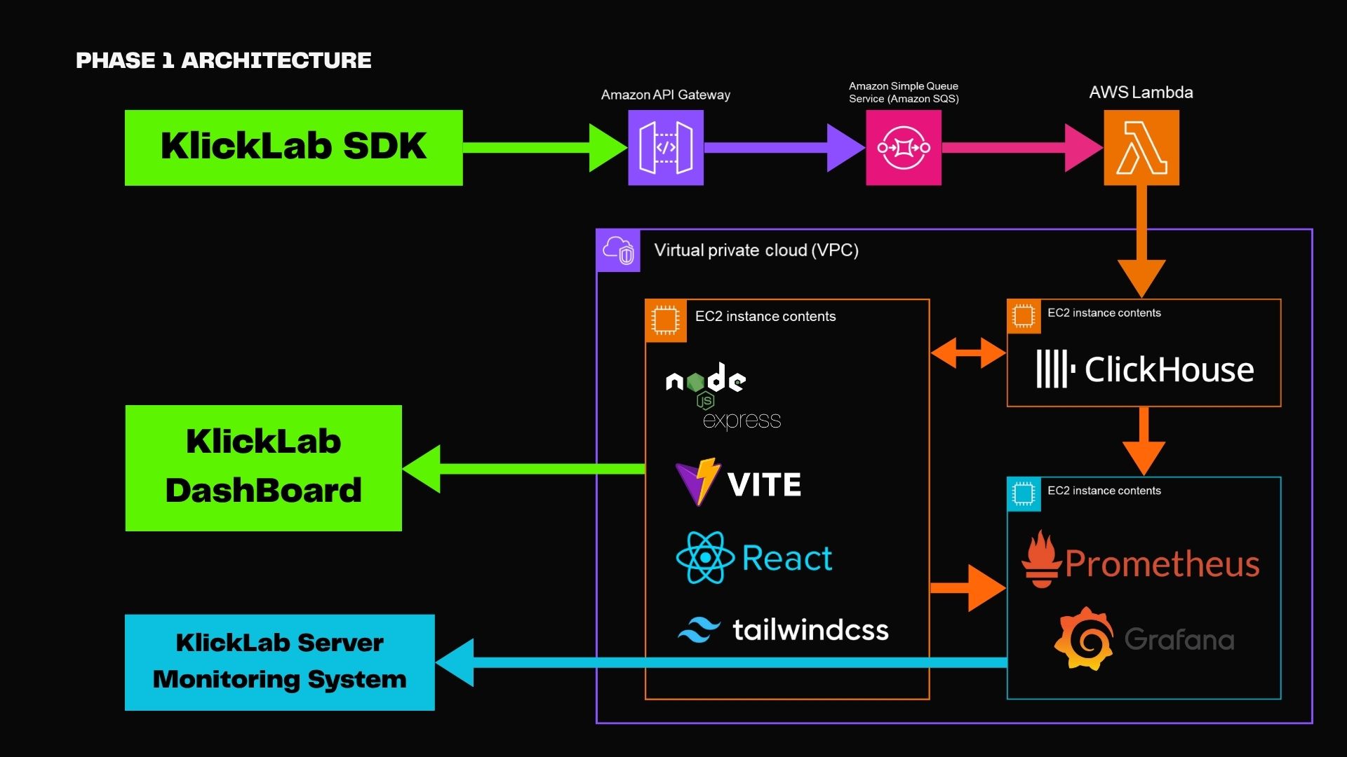 - KlickLab SDK → AWS API Gateway → AWS SQS → AWS Lambda → ClickHouse
