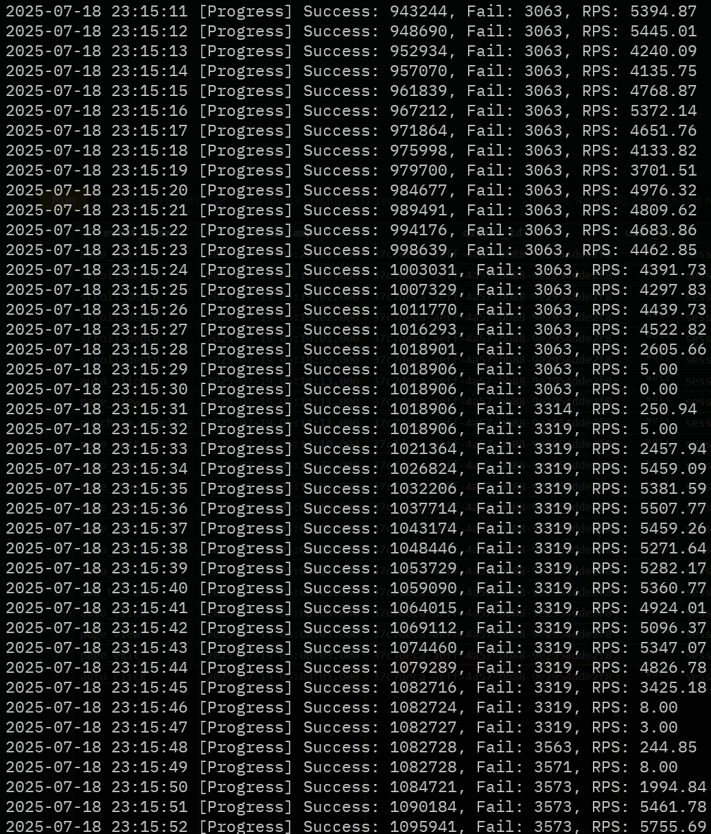 5 000 RPS 이상 유지 후 30 초~1 분 간격으로 RPS가 0 부근까지 급락·회복하는 출렁임 발생.