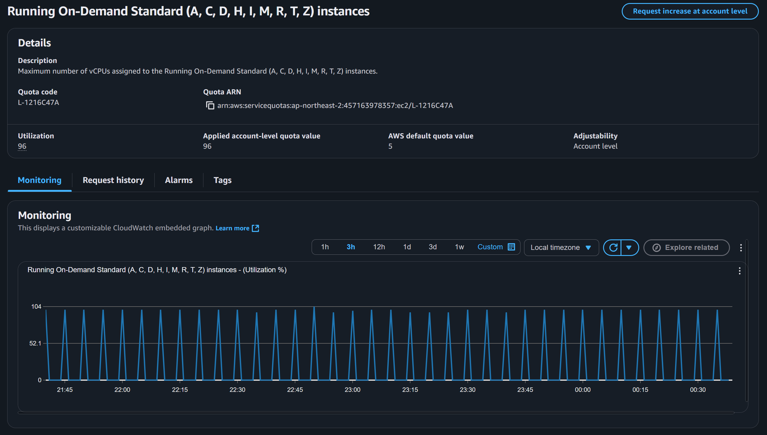 Service Quotas에서 Running On-Demand Standard instances 할당량을 256 vCPU로 상향 신청.