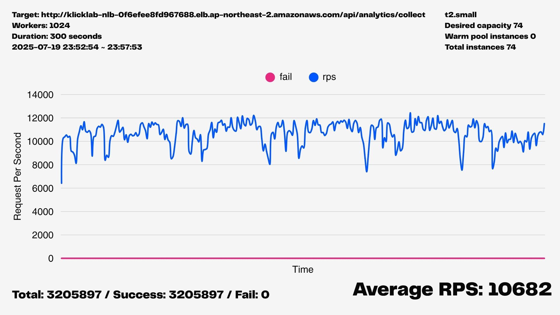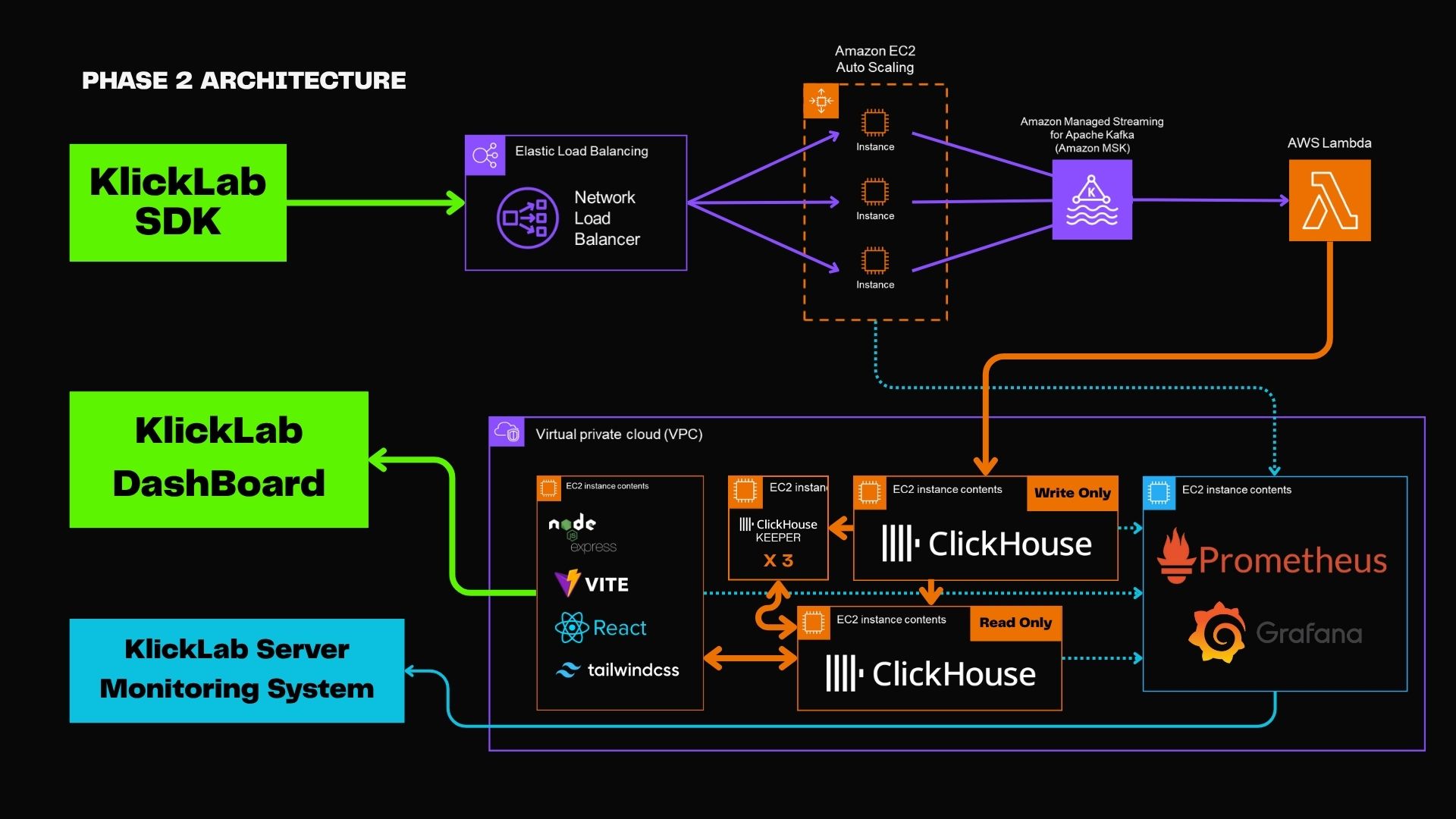 KlickLab SDK → NLB → EC2 (Auto Scaling) → Amazon MSK → AWS Lambda → ClickHouse