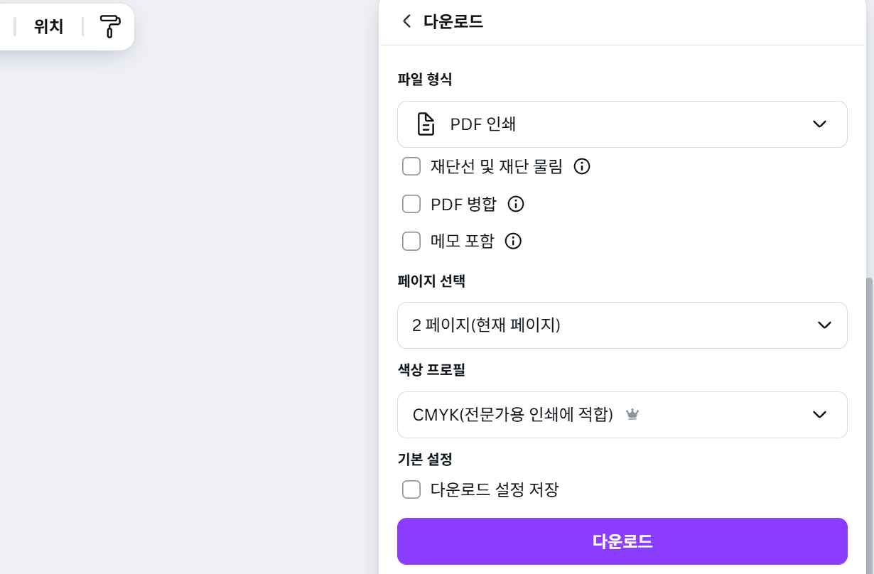 그리고 Canva에서 PDF 인쇄용(CMYK) 저장 옵션은 유료 플랜(Pro) 사용자만 사용할 수 있다.