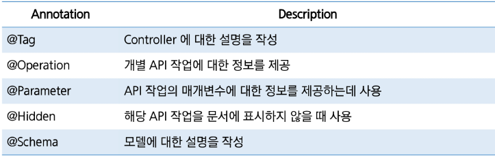- springdoc에서는 API 문서화할 때 다양한 어노테이션 사용