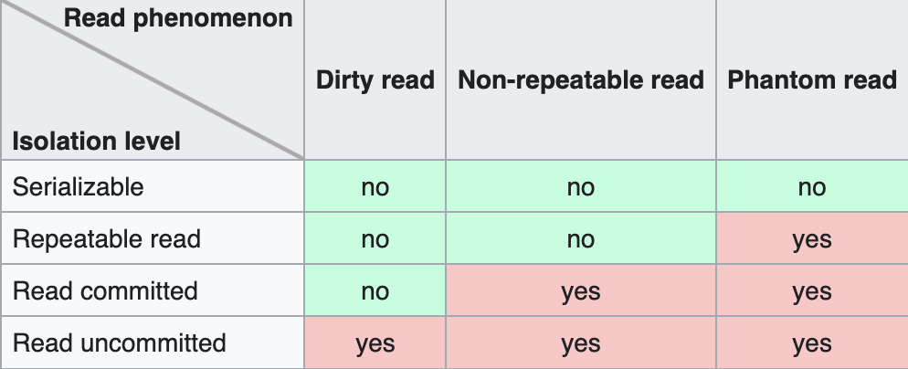 한 Transaction이 접근 중인 데이터에 대한 다른 Transaction의 접근 강도를 설정한다. 아래 그림과 같이 4개의 Levels가 있고, Level이 높아지면 Transaction간 Isolation 강도가 높아지지만, 성능저하도 야기된다.