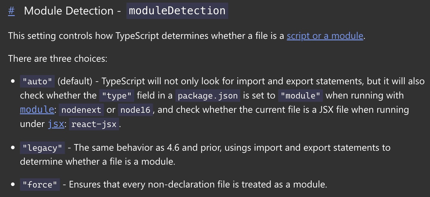 저거 설정하지 않으면 타입스크립트는 자바스크립트와 달리 각각의 ts 파일을 모듈로 보는 게 아니라, 모든 ts 파일을 하나의 모듈로 보기때문에 이런 오류가 발생한다고 한다.