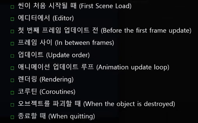 유니티에는 개발자의 편의를 위해 미리 정의해둔 이벤트 함수가 존재합니다.