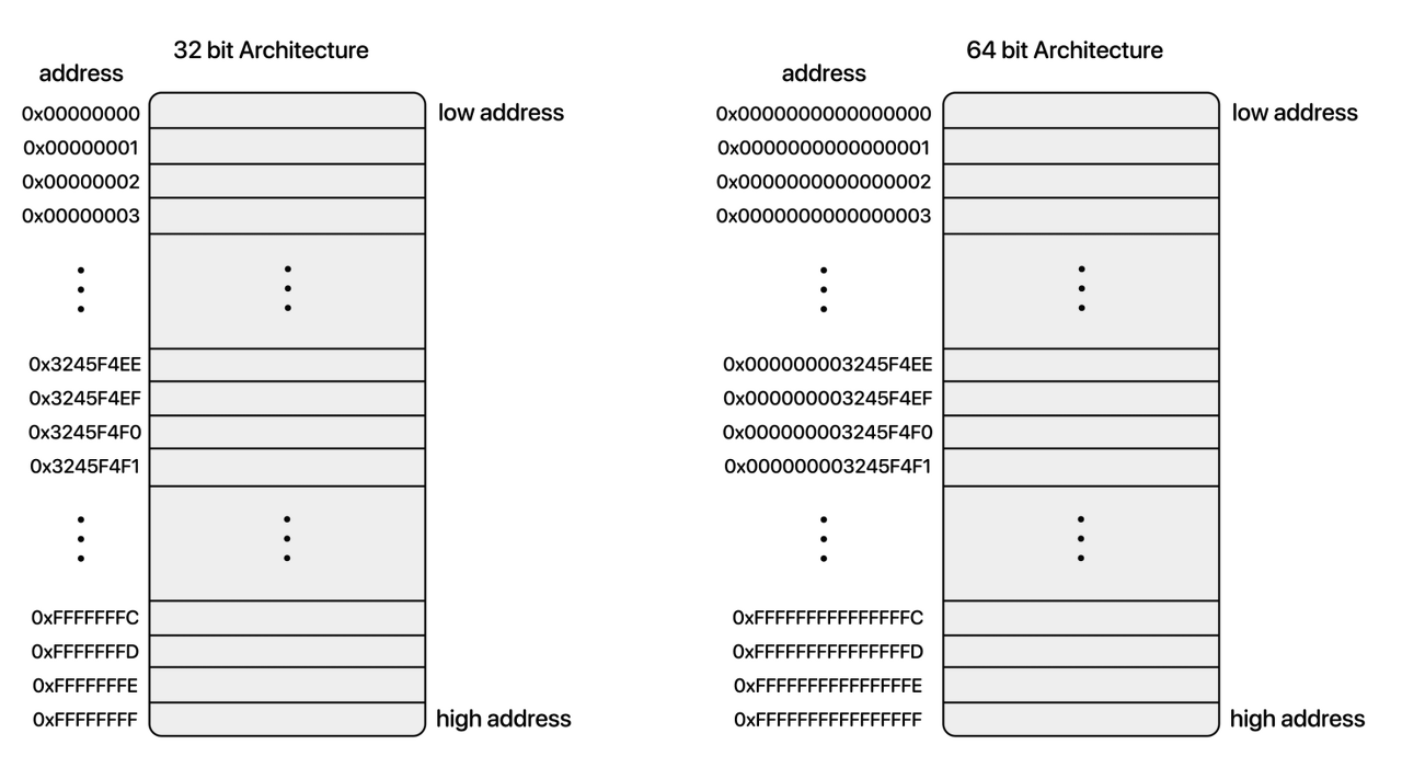 64bit 는 8바이트이므로 하나의 주소가 8바이트 길이의 주소를 갖는다는 것을 알 수 있겠죠? 그리고 마찬가지로 264개. 즉, 18,446,744,073,709,551,616 개의 주소를 가리킬 수 있다는 의미고 이는 18,446,744,073,709,551,616 byte = 16EB(엑사바이트) = 16384PB(페타바이트) = 16777216TB(테라바이트) 까지 입니다.