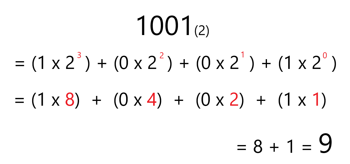 따라서 1001(2진수)을 10진수로 변환하면 9가 된다.