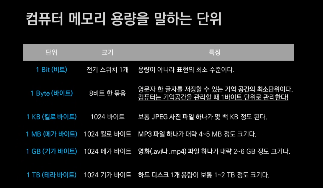 1바이트는 영문자 한 글자가 저장될 수 있는 메모리 크기이며 관리의 최소단위이다.