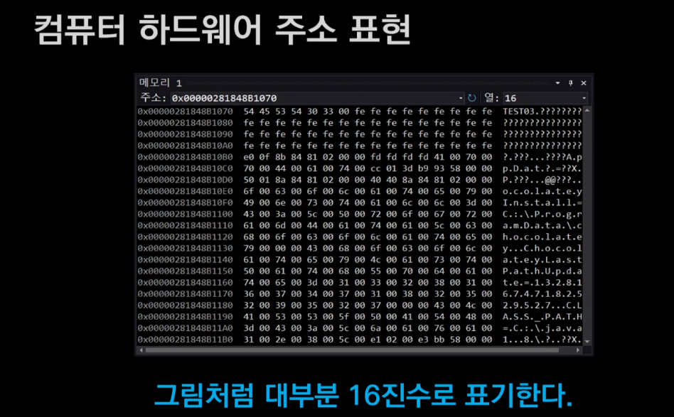하지만 이 주소를 2진수로 표현하기에는 너무 길어 우리는 보통 편의상 16진수로 표현합니다.