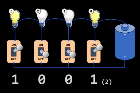 2진법에서 1은 스위치에 불이 들어왔다는 것이다. 이러한 불이 들어온곳의 자리수를 더해주기만 하면 10진수로 표현할 수 있다.