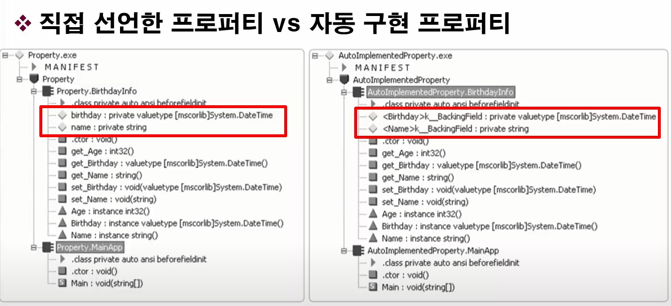 이번에는 AutoImplementedProperty 예제 프로그램에 AutoImplementedProperty.Birthdayinfo 안쪽을 보면 여기에도 마름모 모양 아이콘의 필드가 두개 보입니다. < Birthday >k_BackingField는 Birthday 프로퍼티를 위해, 컴파일러가 물밑에서 선언해준 것입니다. 덕분에 우리는 한결 편한 프로그래밍을 할 수있습니다.