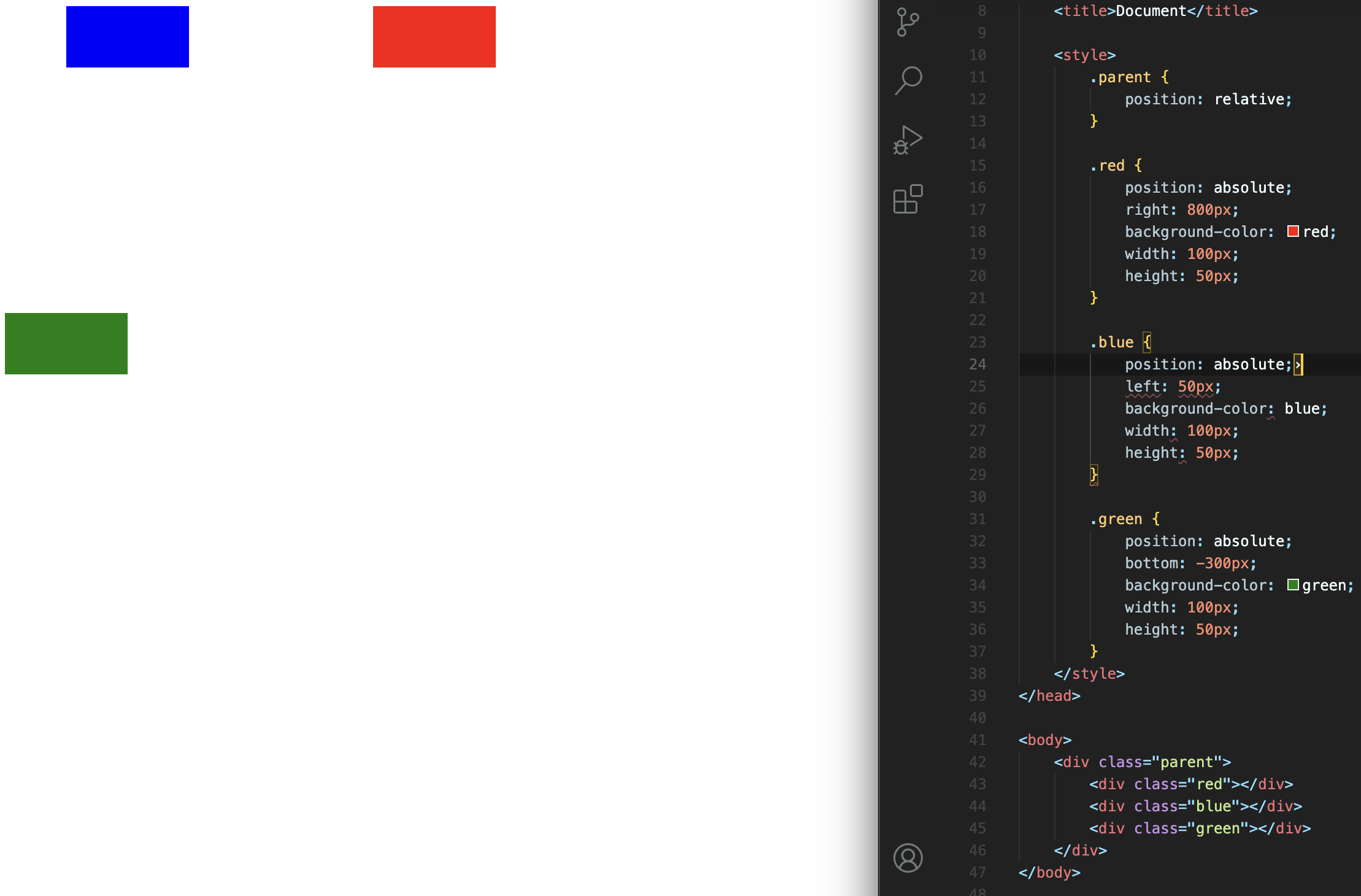 position absolute는 relative 와는 다르게, position 값이 static이 아닌 부모를 기준으로 움직입니다.