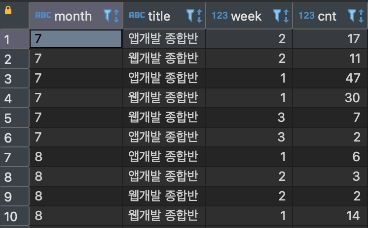 select '7 ' as month, c.title, c2.week, count(*) as cnt from checkins c2 inner join courses c on c2.course_id = c.course_id