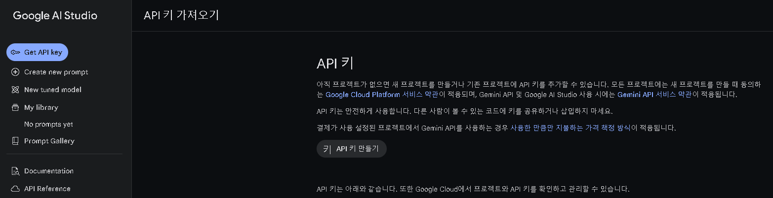 Gemini API를 사용하기 위해서는 인증 키가 필요한다. 따라서 Google Gemini 사이트에 가서 발급받을 수 있다.