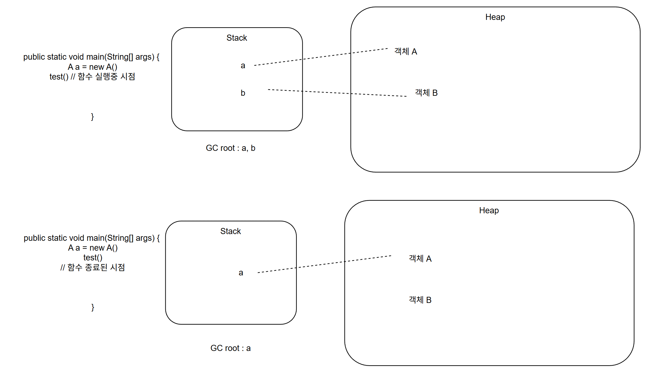 Mark & Sweep : GC root에서 탐색해서 참조되지 않는 Heap의 객체들 삭제. GC root 에 포함될 수 있는 집합은 객체 생성할 때 사용된 변수(Stack 에 있는 객체 주소값)
