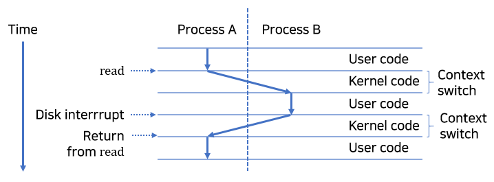 이 때 프로세스의 전환을 운영체제 커널(Kernel)에 의해 관리