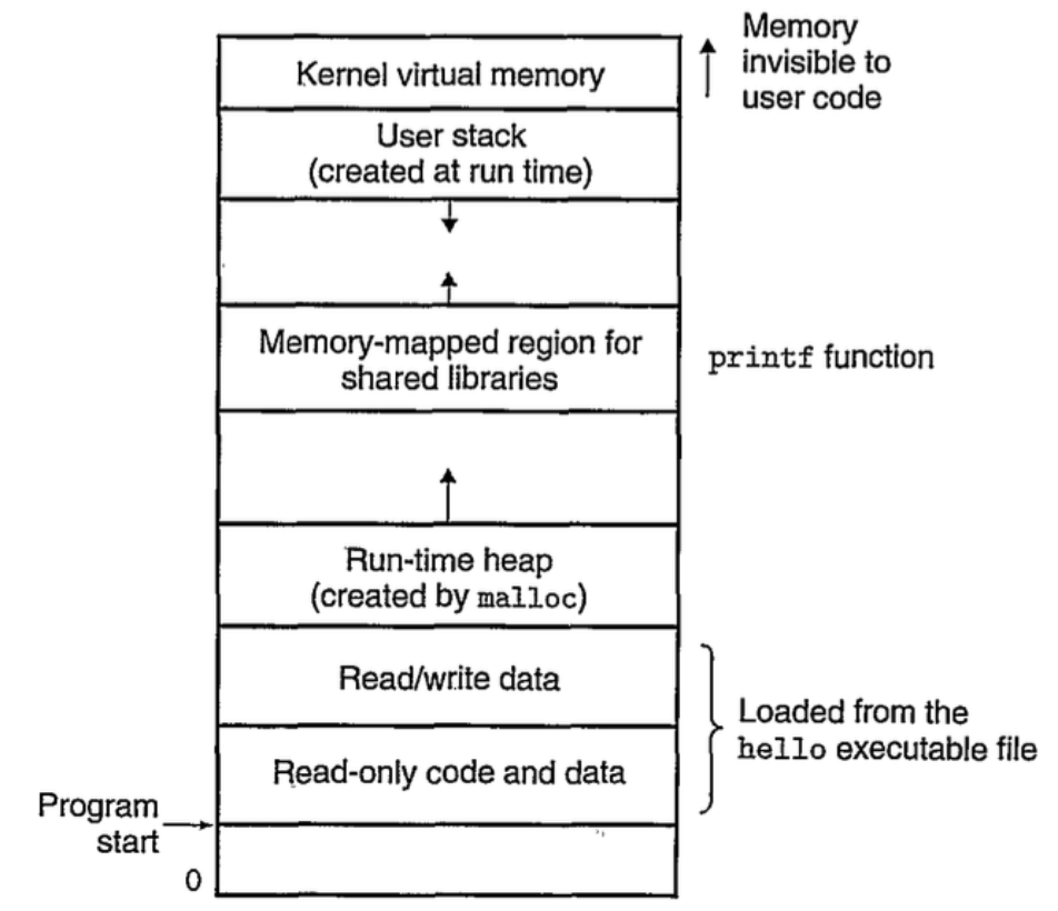 코드는 모든 프로세스들이 같은 고정 주소에서 시작 -> 이 후 C 전역 변수에 대응되는 데이터 위치들이 따라옴. 실행 가능 목적 파일인 hello로부터 직접 초기화.