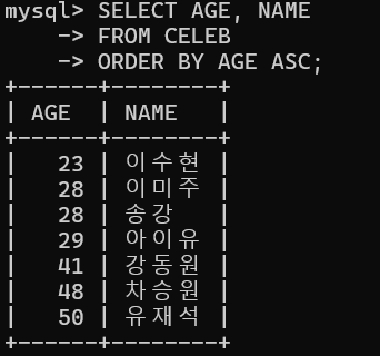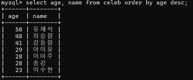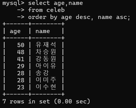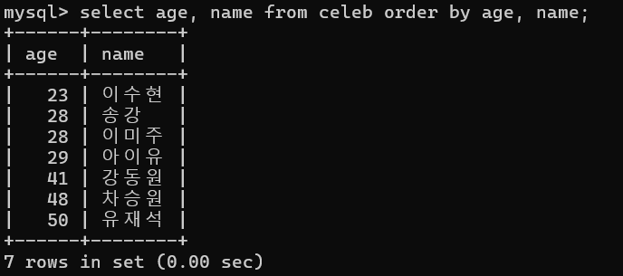 - celeb ํ ์ด๋ธ์์ ์ด๋ฆ๊ณผ ๋์ด๋ฅผ ๋์ด์ ์ด๋ฆ์์ผ๋ก ์ ๋ ฌํ์ฌ ์กฐํ