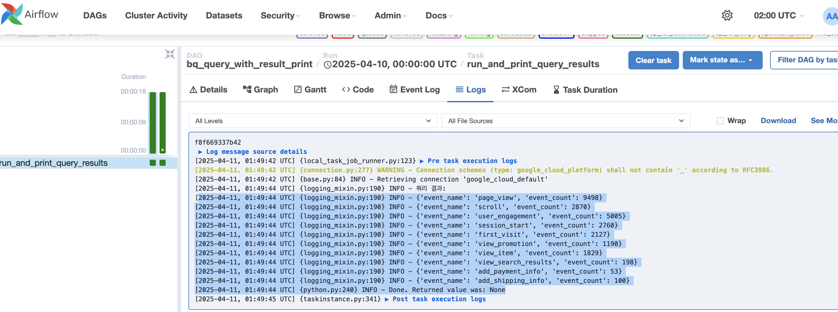 airflow - bigquery간 연결 확인을 위한 테스크로 단일 테스크로 실행