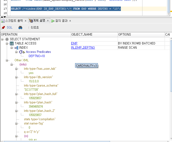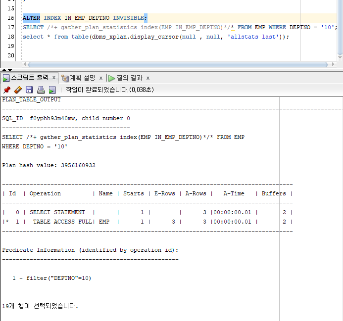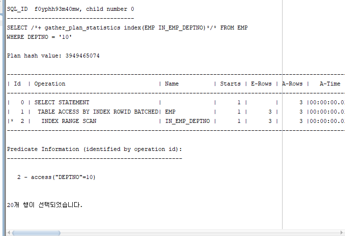 SELECT /*+ gather_plan_statistics index(EMP IN_EMP_DEPTNO)*/* FROM EMP WHERE DEPTNO = '10';
