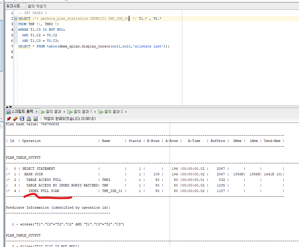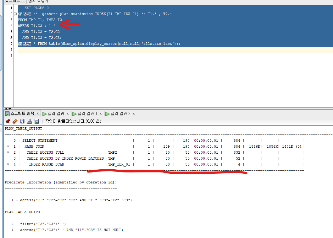 T1.C3와 같은 CHAR 타입의 T1.C3 > '' 을 사용하면 IS NOT NULL 같은 효과를 줄 수 있으며 INDEX RANGE SCAN 을 이용해 Buffer를 줄일 수 있다.