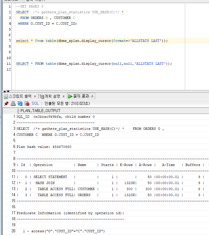HASH JOIN : 둘 중 작은 집합을 읽어 해시 영역에 해시 테이블을 생성하고, 반대쪽 큰 집합을 읽어 해시 테이블을 탐색하면서 조인 ( DW성 데이터 조회시 사용 )
