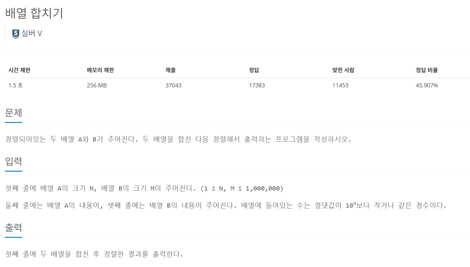 솔직히 너무너무너무 소웨공 프젝때문에 바빠서 오늘도 정렬 날먹을 해보려고 한다.근데 사실 그냥 두 개 합치고 정렬하면 되는거라 엄청 쉽다. 단순하게 두 배열을 합친 후에 정렬하고 출력해주었다. 이게 왜 실버일까?