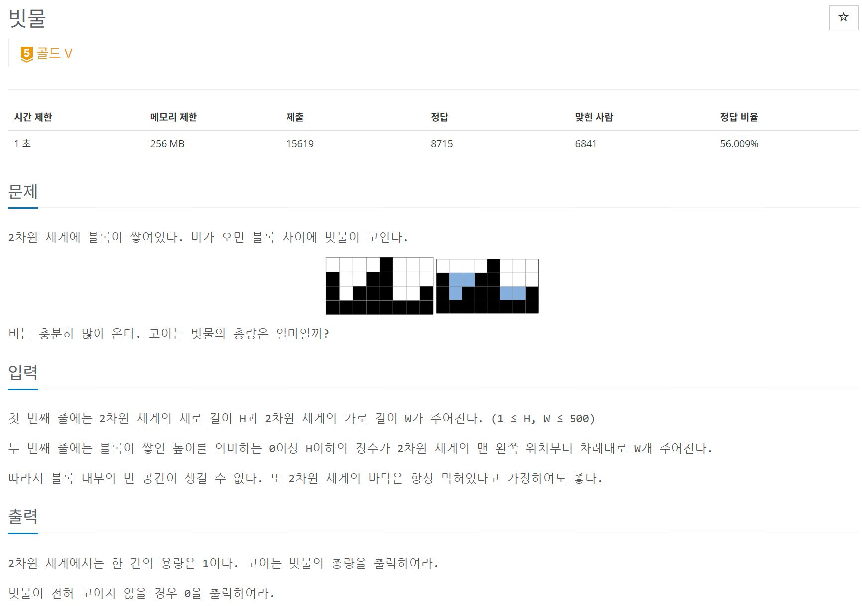 우선 논리구조는 간단하다 왼쪽 오른쪽 해서 그냥 작은걸 기준으로 빼주면 된다. 몇 개의 예외사항이 존재하겠지만 그건 그냥 if문으로 처리해주면 된다는 안일한 생각으로 풀어보았다. 왼쪽 이상의 값이 끝날때까지 나와주는 문항은 비교적 쉽게 해결되었는데 끝까지 안 나오는 경우 + 그 안에서도 웅덩이가 형성되는 경우를 처리하는데 어려움이 있었다. 코드를 보다보면 대충 이해가 갈 것 같다. while문 아래가 그걸 해결하기 위한 시행착오가 좀 녹아있다.