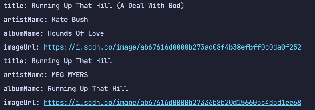 [ArtistSimplified(name=Kate Bush, externalUrls=ExternalUrl(externalUrls={spotify=https://open.spotify.com/artist/1aSxMhuvixZ8h9dK9jIDwL}), href=https://api.spotify.com/v1/artists/1aSxMhuvixZ8h9dK9jIDwL, id=1aSxMhuvixZ8h9dK9jIDwL