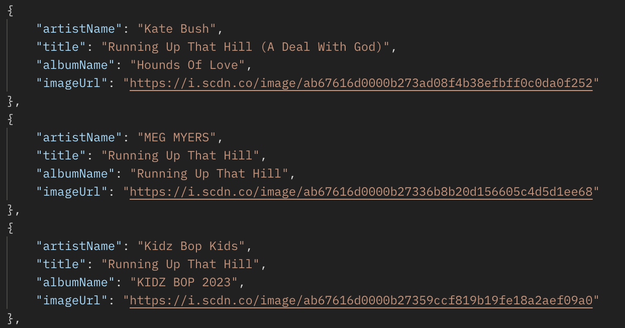 사용자가 노래 제목으로 검색했을 때 응답 값으로 앨범 이름, 앨범 커버 URL, 아티스트 이름, 노래 제목이 필요한 상황입니다.
