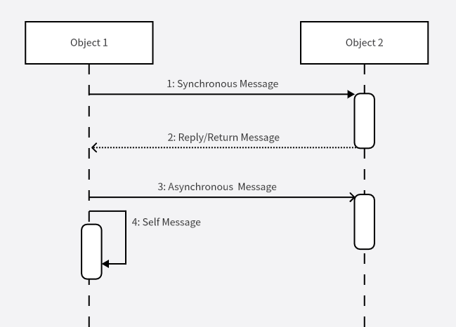 | 동기 메시지--Synchronous Message | 요청을 보낸 뒤 응답이 올 때까지 기다립니다. 프로그램 내 일반적인 함수 호출과 동일한 동작 방식의 메시지를 표현합니다. 동기 메시지 호출은 꽉찬 화살표에 실선으로 표시합니다. |