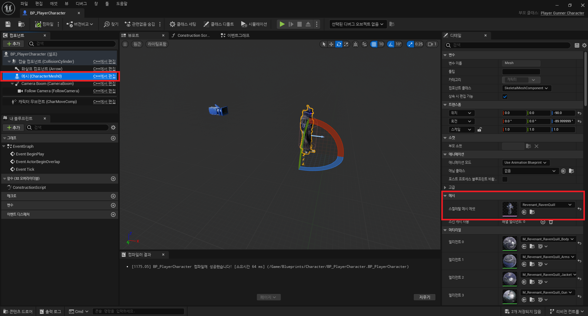 위 처럼 원하는 스켈레탈 메시 에셋을 넣고 위치, 회전 및 CapsuleComponent의 크기를 적절하게 조절합니다.