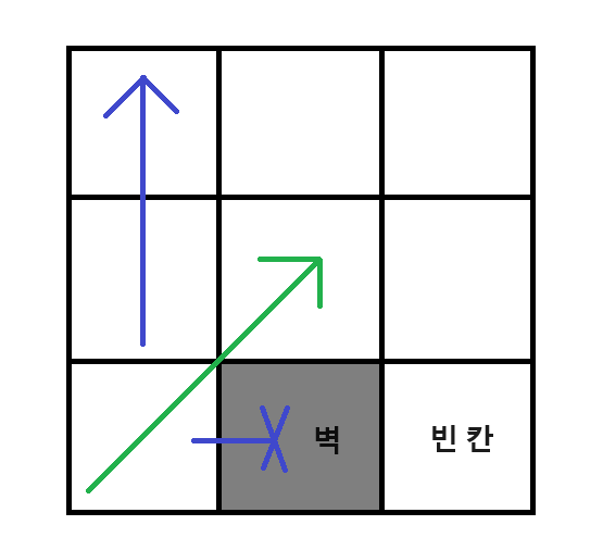 이 때 탐색은 대각선 탐색으로 해야 벽 뒤를 확실하게 검사할 수 있습니다.