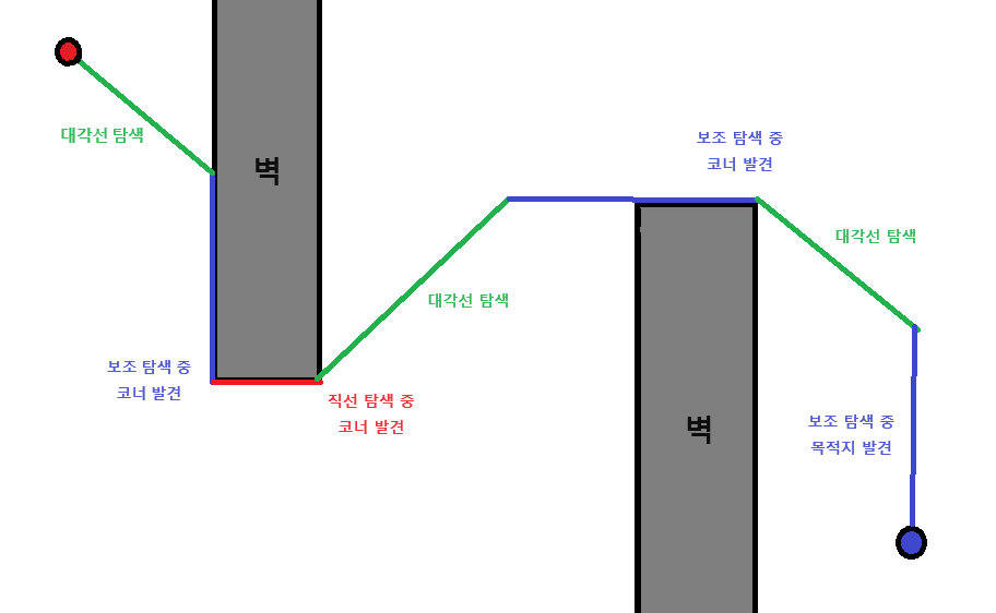 위쪽 보조 탐색은 벽이 없기 때문에 정상적으로 실행되지만, 오른쪽은 벽떄문에 막혀서 탐색하지 못합니다. 이런 경우에 직선과 같이 오른쪽 아래 방향을 대각선 탐색 해주어야 합니다.